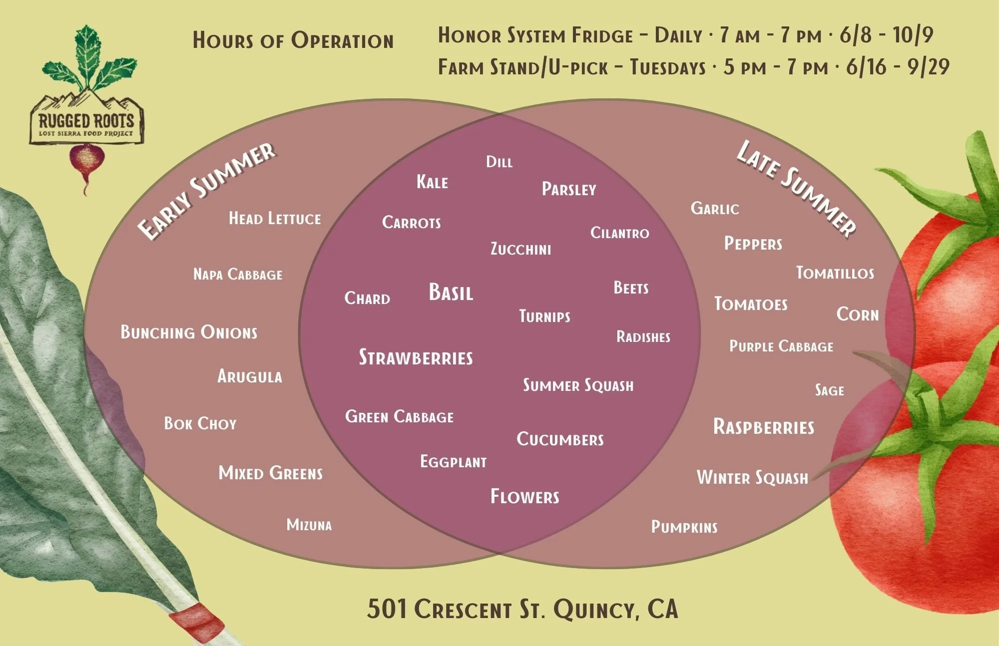 To purchase our veggies, fruit, flowers, and herbs, visit our farm stand during the season open Tuesdays 5pm-7pm, stop by our Honor System Fridge open 7am-7pm daily, or check out our booth at the Quincy Farmers Market.