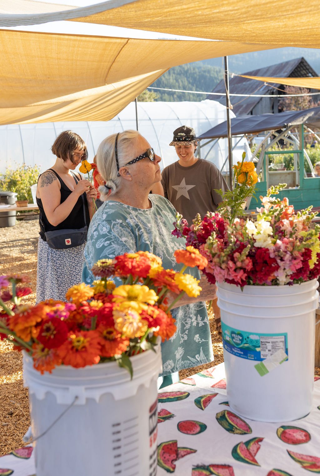 Community members make bouquets using flowers grown on Rugged Roots Farm during a community workshop.